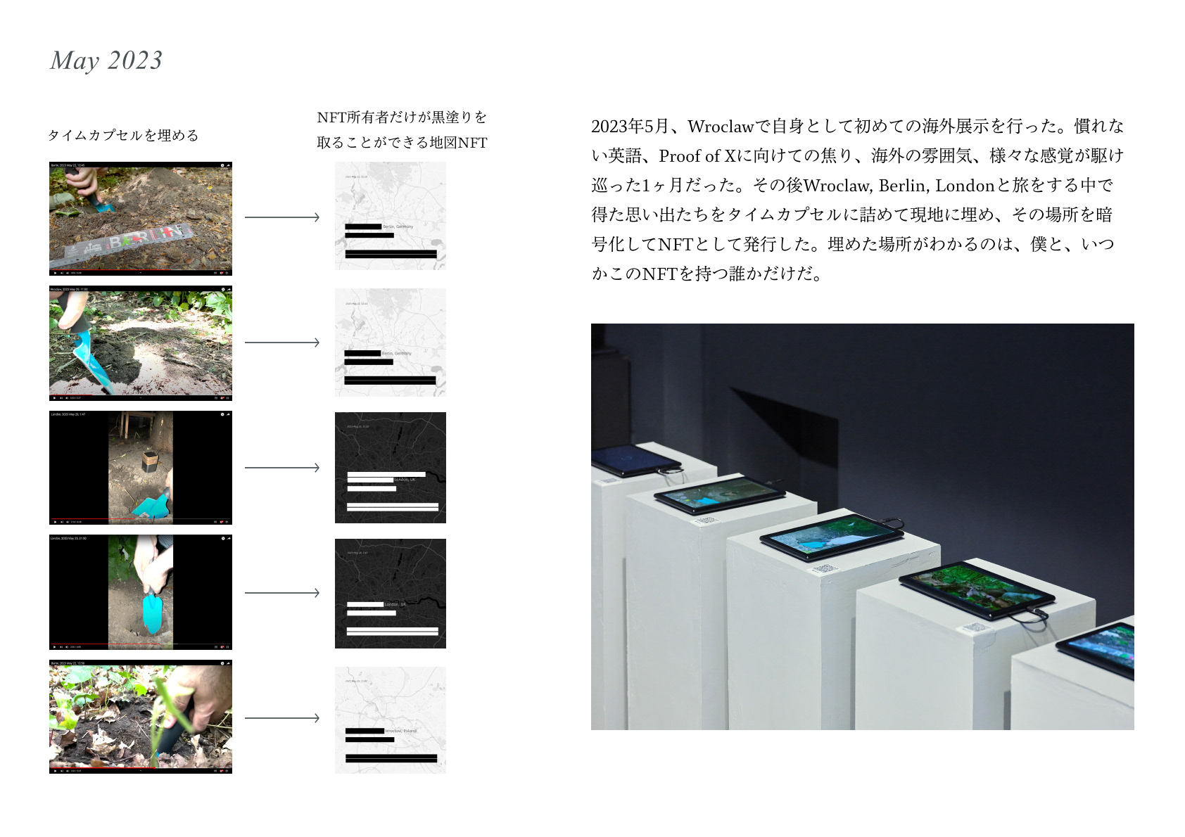 2023年5月、Wroclawで自身として初めての海外展示を行った。慣れない英語、Proof of Xに向けての焦り、海外の雰囲気、様々な感覚が駆け巡った1ヶ月だった。その後Wroclaw, Berlin, Londonと旅をする中で得た思い出たちをタイムカプセルに詰めて現地に埋め、その場所を暗号化してNFTとして発行した。埋めた場所がわかるのは、僕と、いつかこのNFTを持つ誰かだけだ。