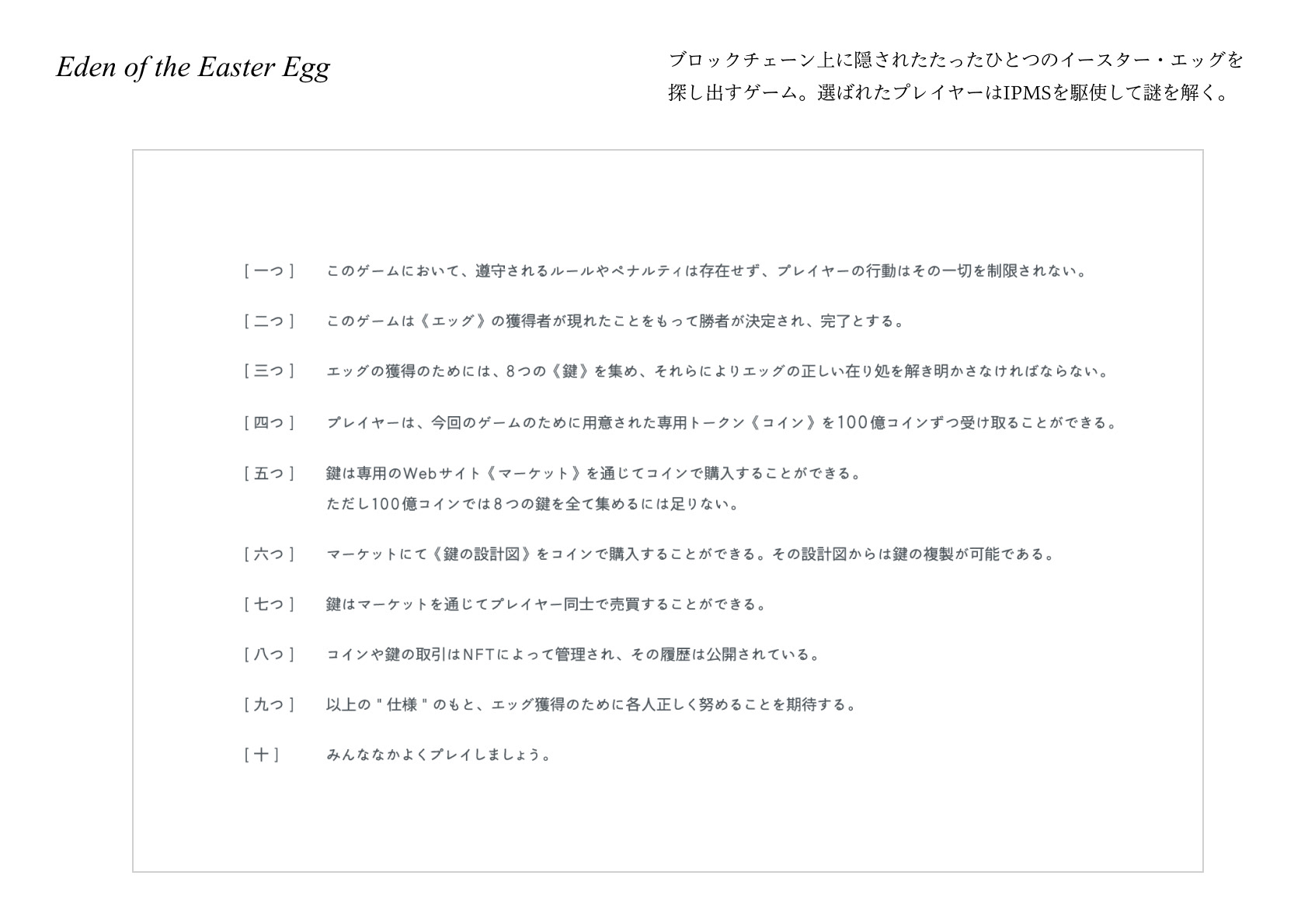 ブロックチェーン上に隠されたたったひとつのイースター・エッグを探し出すゲーム。選ばれたプレイヤーはIPMSを駆使して謎を解く。