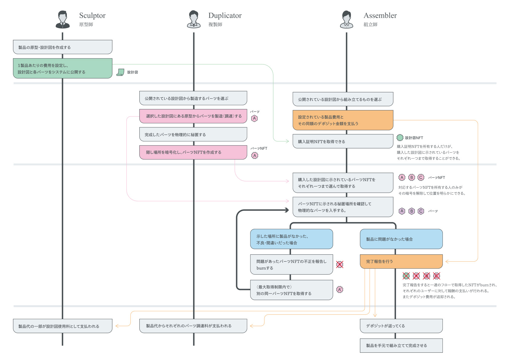 InterPlanetry Manufacturing System - IPMSとは、以下の3つの役割に分けられるユーザーが物理的な製造(調達)の各工程を分散的に担うことで、互いを信用せず、個人情報を一切渡さないまま、一連の製造(調達)工程を達成可能なシステムである。 製品の設計図、原型のモデルを開発する「Sculptor」 原型からパーツを製造・複製し、秘匿した場所を暗号化NFTで共有する「Duplicator」 最終的に全てのパーツを入手して組み合わせる「Assembler」 全ての役割は独立して動くことができ、非同期で各工程が進んでいく。 費用は「Assembler」が支払い、「Sculptor」「Duplicator」は「Assembler」の完了報告によって報酬を得る。システム利用者の拡大に従って分散性が高まり、物理的な調達距離を小さくすることができる。